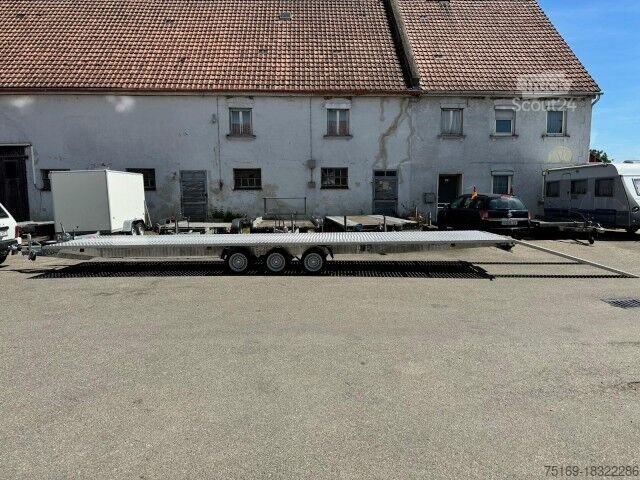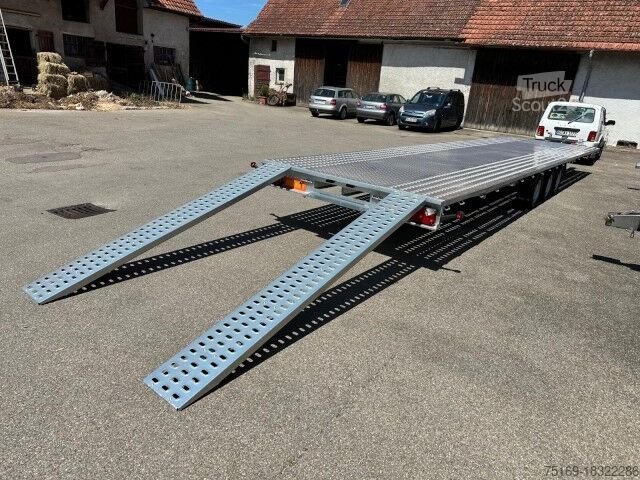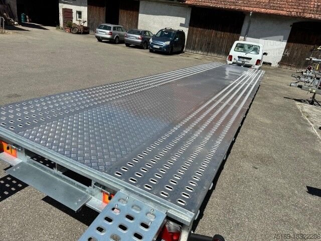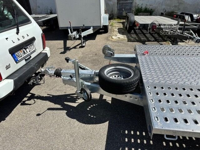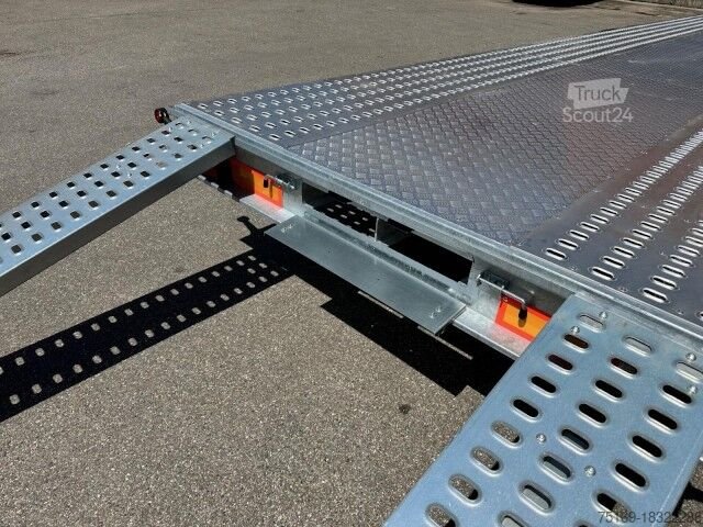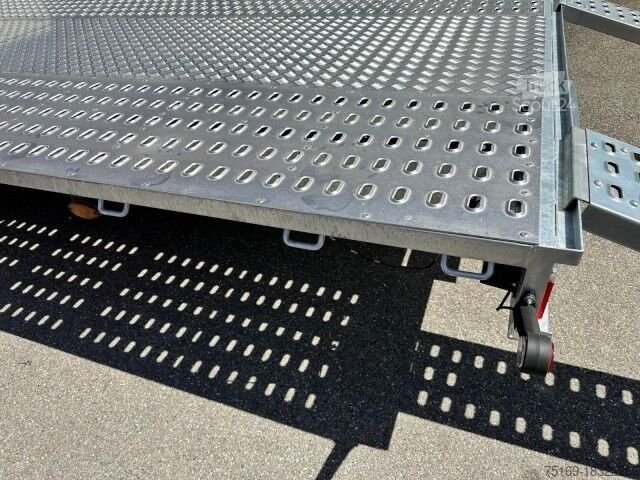 Automatisme de recul, essieu à suspension caoutchouc, suspension indépendante, incl. 2 rampes d’accès sous la plateforme de chargement, roue jockey, feux de gabarit, galvanisation à chaud, freiné, garantie incluse, rampes en acier de 2,5 m, roue de secours incluse, homologation 100 km/h incluse, remorque équipée d’un plancher en aluminium fermé au centre.